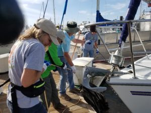 Our group was so efficient we wrapped up at about 10:30am. The Harbormaster had promised lunch for all the volunteers so several of us relaxed for a social moment on the Seagoes boat which just happened to be in Marina 2 (I’m sure the Seagoes weren’t responsible for anything hauled up…).