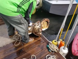 Because of our numbers, we were all assigned to one finger of Marina 2. We had two divers assigned to our finger and they went to work shortly after our arrival at Marina 2. Divers had surveyed the marina in the days prior to the clean up to identify key items to be removed. When the silt on the harbor bottom is disturbed, visibility is significantly impaired, so they wanted to get those key items up first.